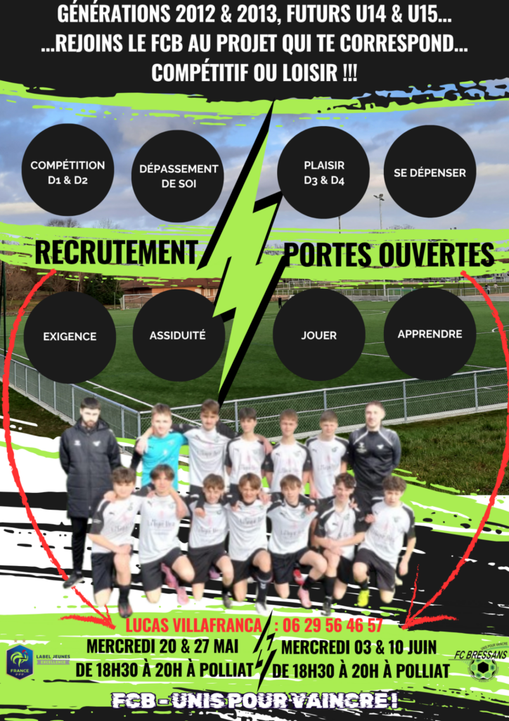 Lucas Villafranca au 06 29 56 46 57 pour toutes questions supplémentaires aux affiches et pour s’inscrire aux actions de portes ouvertes (U7 à U15) ou de recrutements (U15)