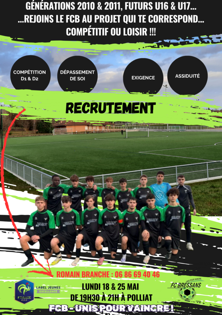 Romain Branche au 06 86 69 40 46 pour toutes questions supplémentaires à l’affiche et pour s’inscrire à l’action de recrutement (U17)
